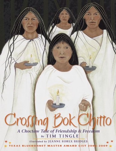 .There is a river called Bok Chitto that cuts through Mississippi. In the days before the War Between the States, in the days before the Trail of Tears, Bok Chitto was a boundary. On one side of the river lived the Choctaws. On the other side lived the plantation owners and their slaves. If a slave escaped and made his way across Bok Chitto, the slave was free.Thus begins Crossing Bok Chitto, told by award-winning Choctaw storyteller Tim Tingle and brought to life with the rich illustrations of Jeanne Rorex Bridges.Martha Tom, a young Choctaw girl, knows better than to cross Bok Chitto, but one day—in search of blackberries—she disobeys her mother and finds herself on the other side. A tall slave discovers Martha Tom. A friendship begins